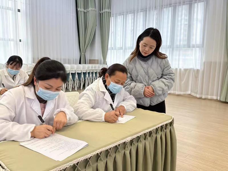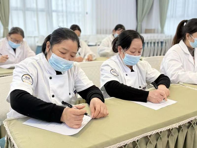 大赛的第一环节是理论考试,试卷上的每一道题都围绕着孩子们的日常——食品安全规范、卫生消毒流程、幼儿应急护理、膳食营养搭配等。食堂阿姨和保育员们沉着作答,笔尖在纸上沙沙作响,她们把平时工作中积累的经验和牢记的准则认真书写下来,用扎实的理论知识为孩子们的健康筑牢第一道防线。