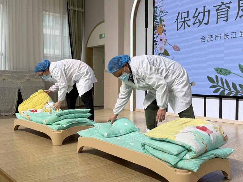 保育员们的技能展示同样充满温情与专业。叠被子环节中,保育员们动作娴熟又轻柔,先把被子轻轻铺平,仔细压平褶皱,再精准折叠、整理边角,短短几分钟,原本松散的被子就变成了方方正正、棱角分明的“小豆腐块”,就像给孩子们的小床铺穿上了“整齐的新衣”。