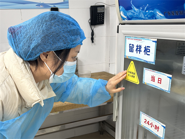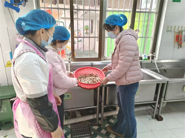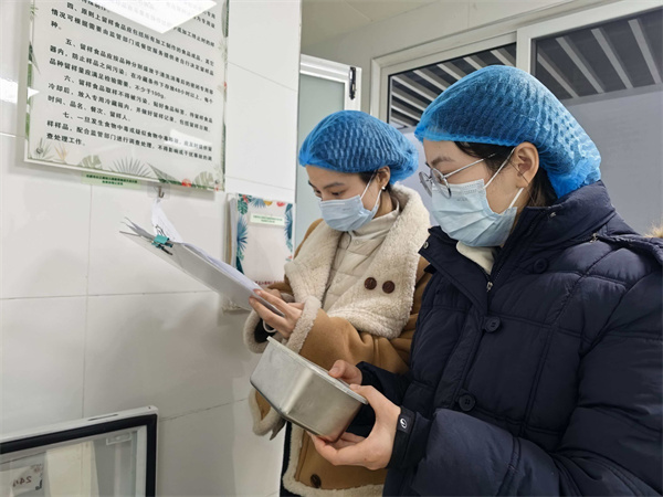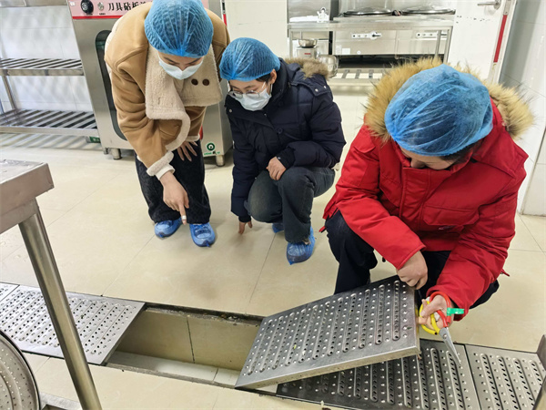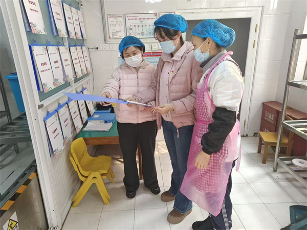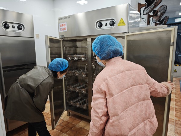 最后开展食品安全检查。检查组深入食堂操作间,查看油污清理、食材分类存放情况,核验水电气管道及厨具设备运行状态;重点检查儿童餐具消毒柜的运行状况与消毒记录,细致核对食品采购凭证、调味品保质期以及各类台账记录,全方位阻断食品安全隐患。
