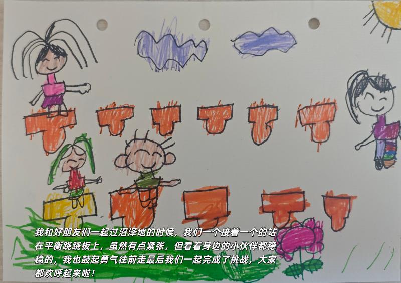 本次体能闯关活动设置“彩虹弯道”“高空栈道”“沼地险道”三关,难度从静态行走、高空适应到护物动态任务逐步进阶,既契合幼儿技能发展规律,又能有效锻炼幼儿的平衡能力与专注力。这就要求体育游戏的关卡设计不仅需精准匹配幼儿能力梯度;同时要敏锐观察幼儿在不同挑战中的状态,及时引导支持、因材施教,让每个幼儿都能在闯关成长中闪闪发光。