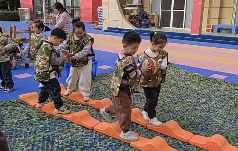 大班宝贝静态平衡技能小有所成,但动态重心调整颇具挑战,部分幼儿在合作游戏中还会畏难退缩。京福园的老师们打造“平衡特工队”主题活动,设置三关趣味挑战:“彩虹弯道”走平衡木、“高空栈道”攀梯通行、“沼地险道”持弹药过晃动平衡板,护物成功方为闯关胜利,掉落则需重新挑战。