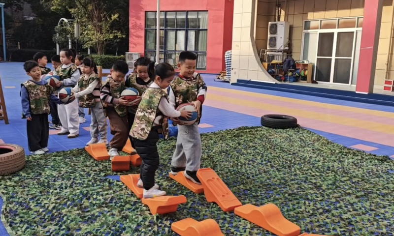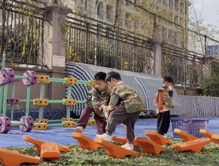 掌握平衡板技巧后,宝贝们不满足于单人闯关,自发围坐讨论,设计全新游戏方案。来到户外,他们兴致勃勃开启挑战:先两两结伴护“弹药”过倒置平衡板,再大胆尝试一正一倒的交错平衡板,最后解锁正向摆放的关卡,在欢声笑语中完成一轮又一轮闯关。