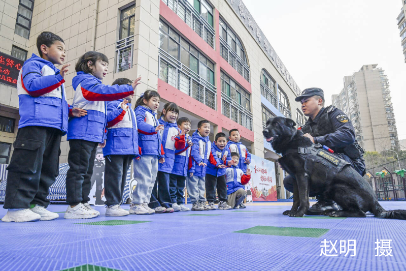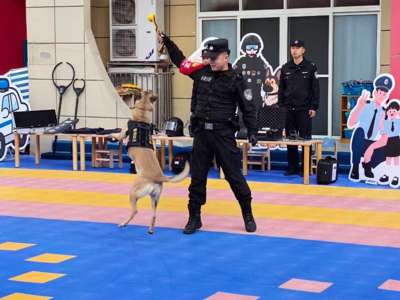 最让孩子们兴奋的,莫过于警犬表演环节。训导员叔叔带着警犬闪亮登场,精神抖擞的警犬瞬间成为全场焦点。在训导员的指挥下,警犬依次展示了坐、卧、立、握手等基础动作,随后又进行了扑咬演练,敏捷的身手、精准的动作赢得了孩子们的阵阵掌声。活动中,孩子们还在老师和训导员的保护下,近距离与警犬互动,感受警犬的忠诚与勇敢。
