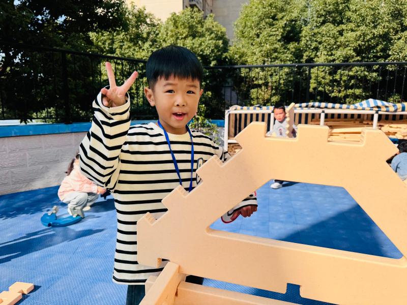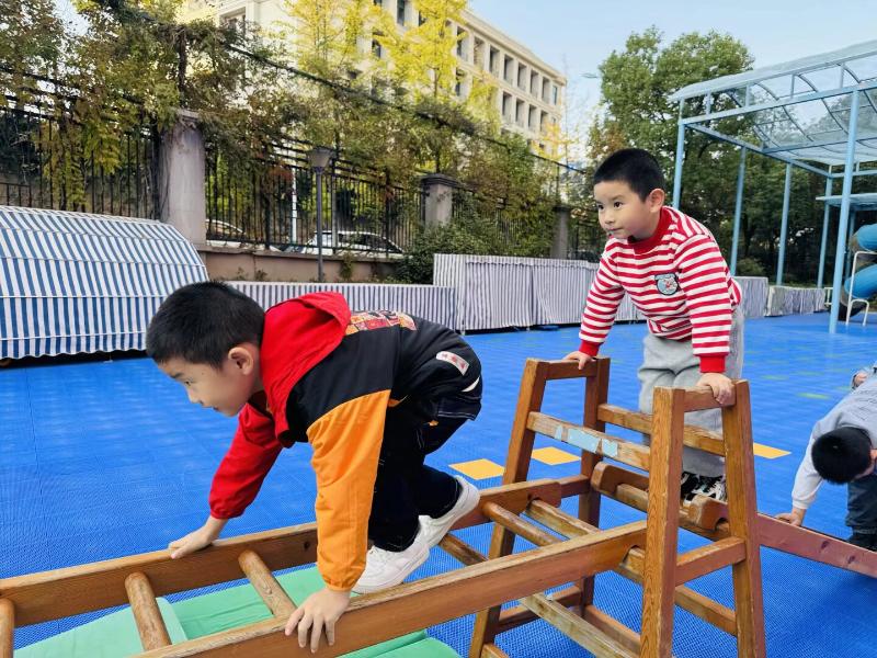 万能工匠区中,宝贝们借助木梯、安吉箱等器械挑战平衡,在反复尝试中增强手脚协调与平衡感,培养专注与坚持,让 “乐动” 课程实现 “动中育健、动中启智”。