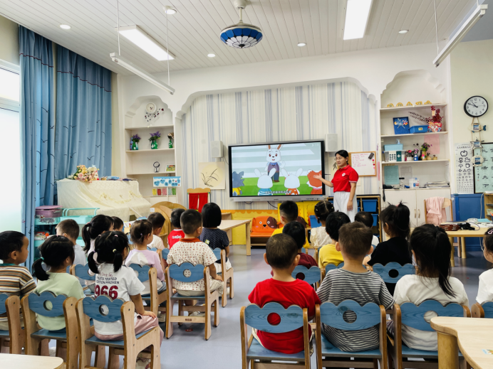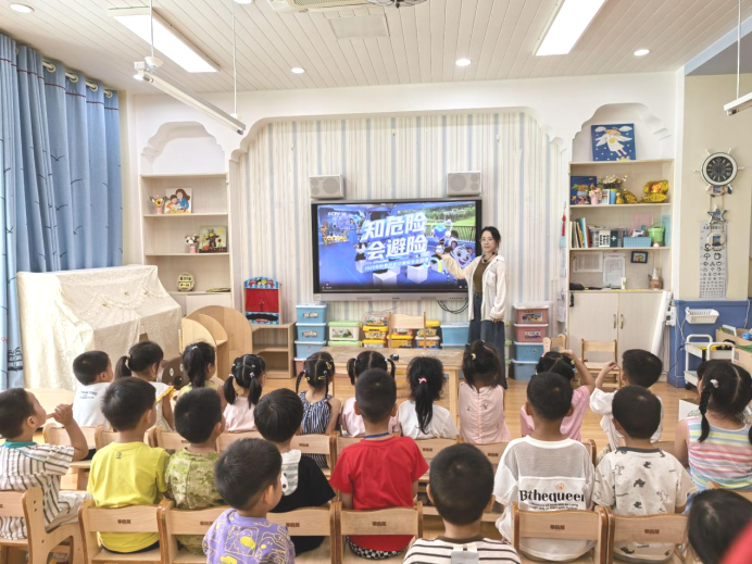 此外,在假期前,教师在班级也进行了30分钟的安全教育。针对幼儿园孩子年龄小、好奇心强的特点,老师将“防溺水”、“居家安全”等内容改编成儿歌和手指谣,孩子们在传唱中牢记安全规范。