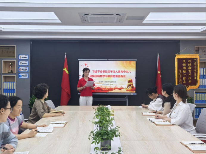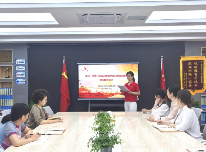 为深化学习教育成果,传承伟大精神力量,2025年9月30日,合肥市长江路幼儿园党支部在长幼党支部书记、总园长丁婕的统筹安排下开展了九月党员活动日暨深入贯彻中央八项规定精神学习教育总结会。本次会议由长幼党支部副书记余璐主持,全体党员参加,通过“理论学习+反思回顾+实践服务”的形式,推动党员教育走深走实。