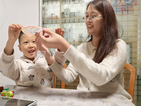5.尝试将一个轻一点的小玩具放入杯子中,让降落伞从高处落下。