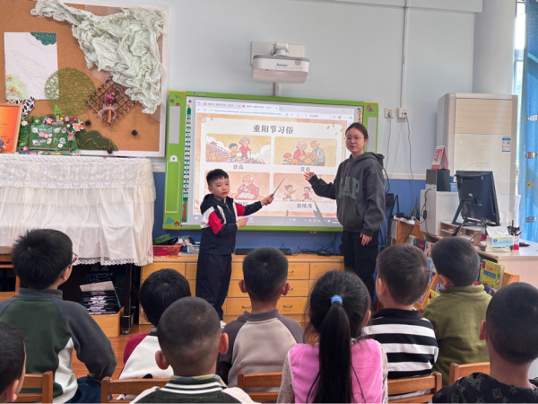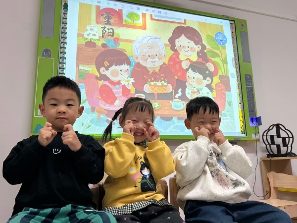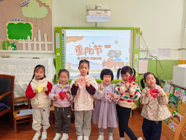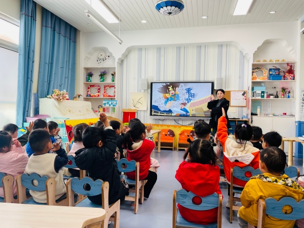 活动开始,各班级教师通过生动的方式为幼儿科普重阳节知识。小班老师借助《重阳节的故事》绘本,用动画般的语言讲述节日由来,还带领孩子们观察菊花图片,认识“赏菊”习俗;中班孩子专注地绘制“感恩贺卡”,用蜡笔涂上鲜艳的颜色,再画上小爱心,将真挚情感藏进卡片里;大班则通过短视频了解“登高”“插茱萸”的传统,还跟着老师学唱《重阳拍手歌》,朗诵《九月九日忆山东兄弟》等简单诗句,用稚嫩的声音传递对传统文化的喜爱。
