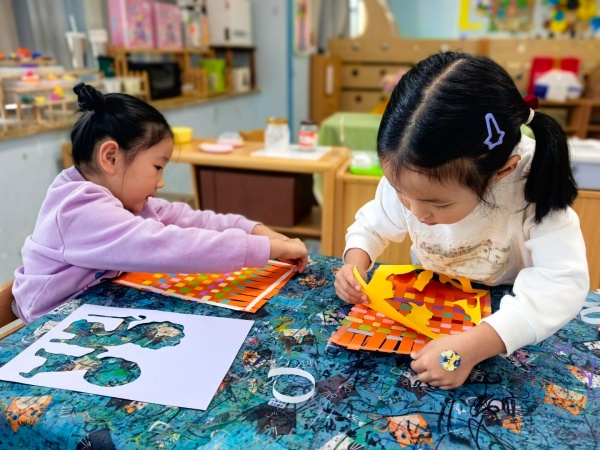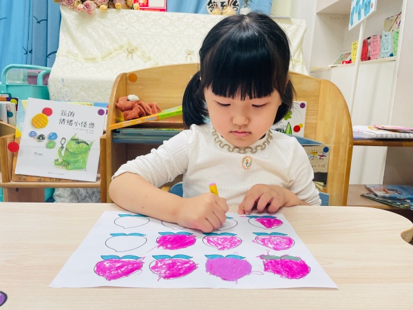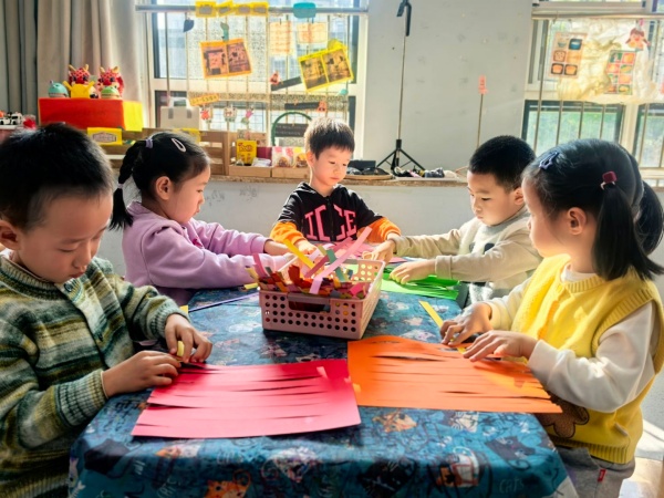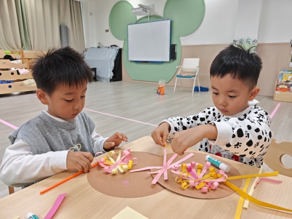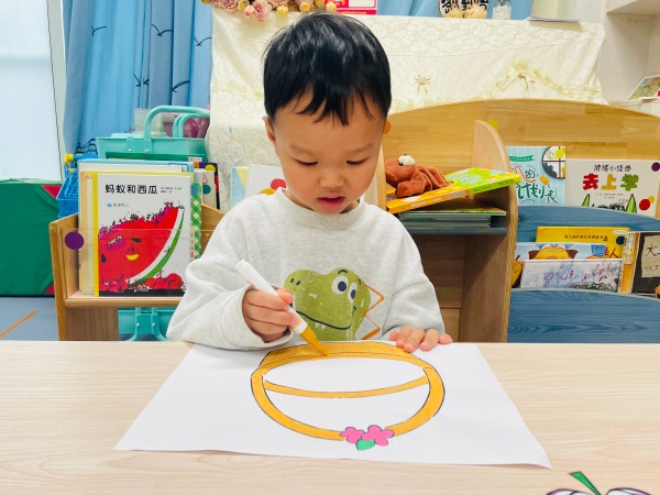 美术活动环节更是充满温情,孩子们化身 “小小设计师”,为社区老人制作专属礼物。教师提前将彩色卡纸裁剪成花篮形状的半成品,桌上整齐摆放着蜡笔、固体胶和画有寿桃的模板。孩子们认真挑选喜欢的颜色,有的模仿模板画寿桃,有的发挥想象给寿桃添上叶子,红色的桃身、绿色的桃叶,鲜艳的色彩在纸上慢慢绽放。涂画完成后,他们小心翼翼地用固体胶将寿桃粘贴在花篮上,小手轻轻按压,生怕弄坏作品。不一会儿,一个个寓意 “福如东海、寿比南山” 的手工花篮就完成了,每一个花篮都承载着孩子们纯真的爱心与美好的祝愿。