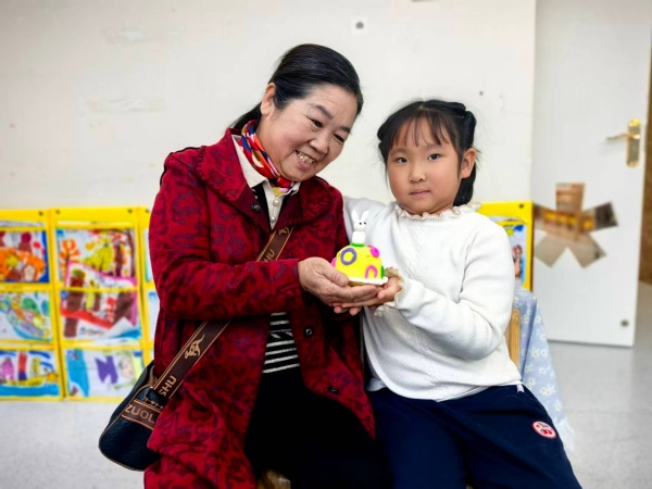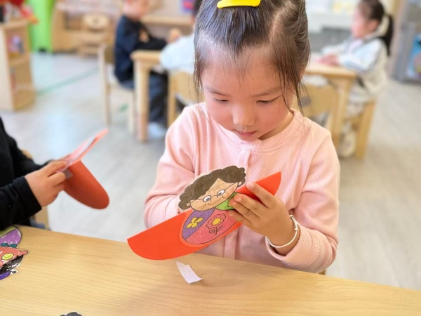 中班聚焦“巧手制翁,孝亲暖心”,开展“不倒翁摇摇乐”活动。老师以“爷爷奶奶像不倒翁一样坚强”引入,分发材料,指导孩子们创作不倒翁摇摇乐。放学时,孩子们紧紧捧着自己做的不倒翁,见到来接的长辈就立刻递上,并兴奋说:“奶奶这个是我画的你,你看这个衣物的颜色和你穿的衣服很像,而且怎么摇都不会倒”,稚嫩的话语与礼物让长辈们笑意满满。