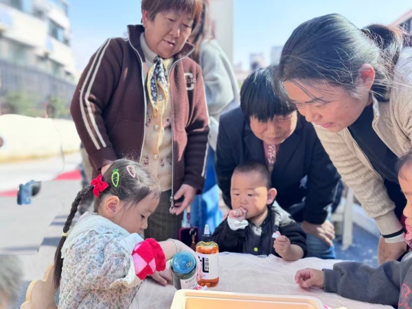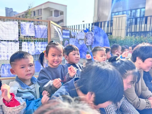 小班年级组以“扎染送暖,传承美德”为主线,开展社区互动。老师笑着说:“九月初九重阳节,以前人们插茱萸保平安,这是专门尊敬长辈们的节日!”轻柔音乐里,孩子们凑到长辈身边捶背、捏肩、拥抱,念叨着“您辛苦啦”,老师定格温馨瞬间。随后孩子们用白色方巾、安全染料做扎染,有小朋友边做边说“要给奶奶做最漂亮的”,完成后双手递向长辈,齐声说“送给您”,最后集体合影,让敬老美德落地。