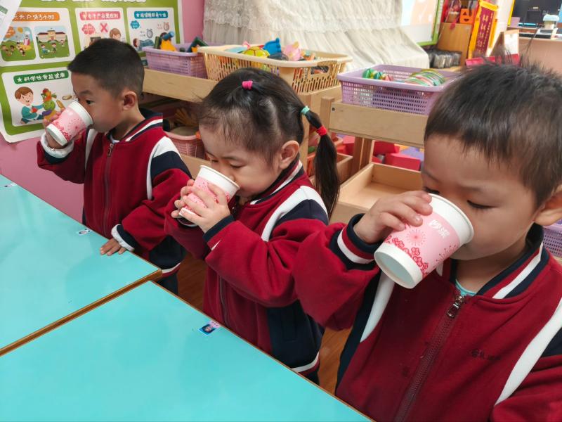 金黄的南瓜奶昔冒着温热的气息,入口丝滑,带着南瓜的甜和牛奶的香。宝贝们在老师的引导下端起杯子,小口小口品尝,温热的奶昔滑过喉咙,脸上瞬间绽放出满足的笑容。有的宝贝一边喝一边指着窗外:“老师,奶昔和树叶一样黄!” 有的则拉着小伙伴分享:“你尝尝我的!” 秋阳透过窗户洒在桌子上,伴着宝贝们的笑声和奶昔的甜香,满是秋日的温馨。