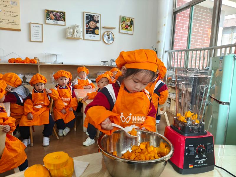 第三步:宝贝们轮流用小勺子,小心翼翼地将南瓜块舀进料理机。待所有南瓜块放入后,老师启动料理机,南瓜块慢慢变成细腻的南瓜泥。加入适量纯牛奶和少量白糖。搅拌均匀后,老师将混合好的食材倒入锅具,放在电磁炉上加水小火慢煮,并不时搅拌防止糊底,淡淡的甜香逐渐弥漫。