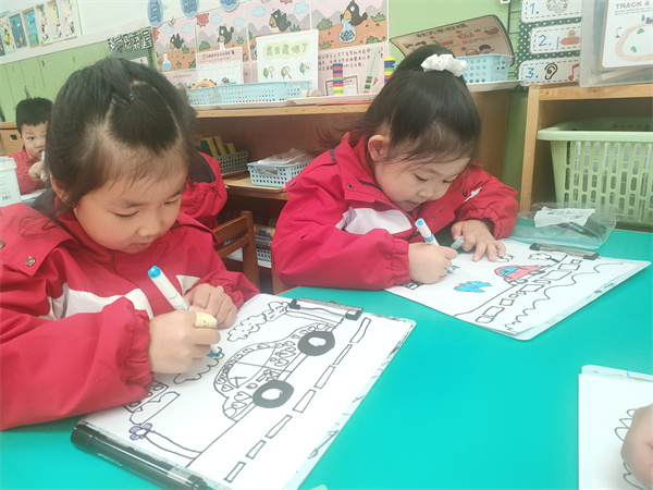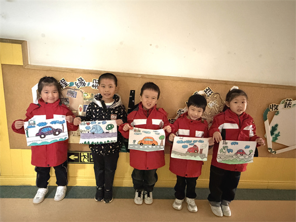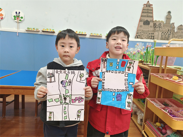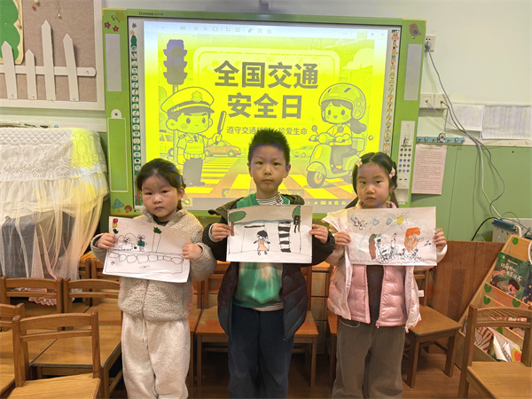 各年级组围绕幼儿年龄特点,同步开展了形式多样、贴近儿童的主题实践活动,将交通安全教育融入体验与创造之中。小班幼儿通过观看《安全过马路》等生动动画,在教师引导下认识车辆、信号灯与斑马线。孩子们在“红灯绿灯小汽车”模拟游戏中,以趣味化地走走停停,初步树立远离车辆的安全意识。中班幼儿开展了“我眼中的文明交通”主题绘画,用画笔描绘礼让行人、正确佩戴头盔等文明场景。随后,孩子们通过分享听来的小故事,分辨出行行为的对错,加深对交通规则的理解与认同。大班则创设“我是交通小卫士”角色体验区。幼儿通过扮演交警、行人等角色,在模拟路口情境中实践交通指挥与安全通行。沉浸式的游戏不仅巩固了标志认知与通行规则,也锻炼了他们在实际情境中的判断与应变能力,切实体会到秩序对交通安全的重要作用。