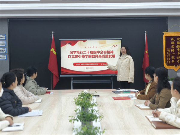 为全面落实党的二十届四中全会精神,强化党员教师和入党积极分子的责任担当,以高质量党建赋能学前教育提质增效,2025年12 月19日下午,合肥市长江路幼儿园党支部开展第四季度专题党课活动。本次党课由党支部书记丁婕主讲,全体党员和入党积极分子齐聚一堂,共同领悟全会精神、凝聚育人共识。