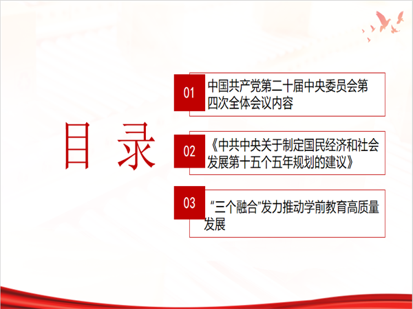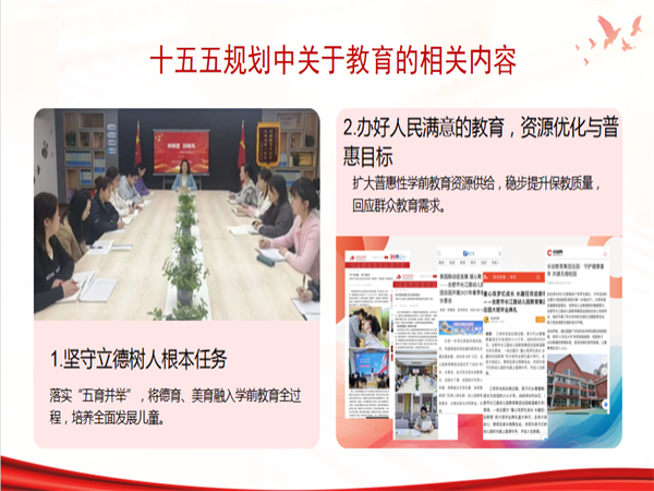 丁婕书记在党课中指出,党的二十届四中全会是在关键时期召开的重要会议,审议通过的《中共中央关于制定国民经济和社会发展第十五个五年规划的建议》,为教育事业高质量发展擘画了宏伟蓝图。其中 “一体推进教育科技人才发展” 的重要部署,与学前教育的初心使命高度契合,为幼儿园创新发展提供了根本遵循。她结合园所 “和乐教育” 理念,强调要把全会精神转化为教育实践的具体行动,将红色基因融入保教全过程,推动党建工作与保教业务深度融合,让党建之花在幼教园地绚烂绽放。