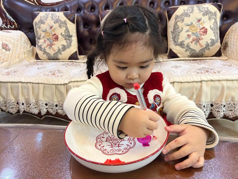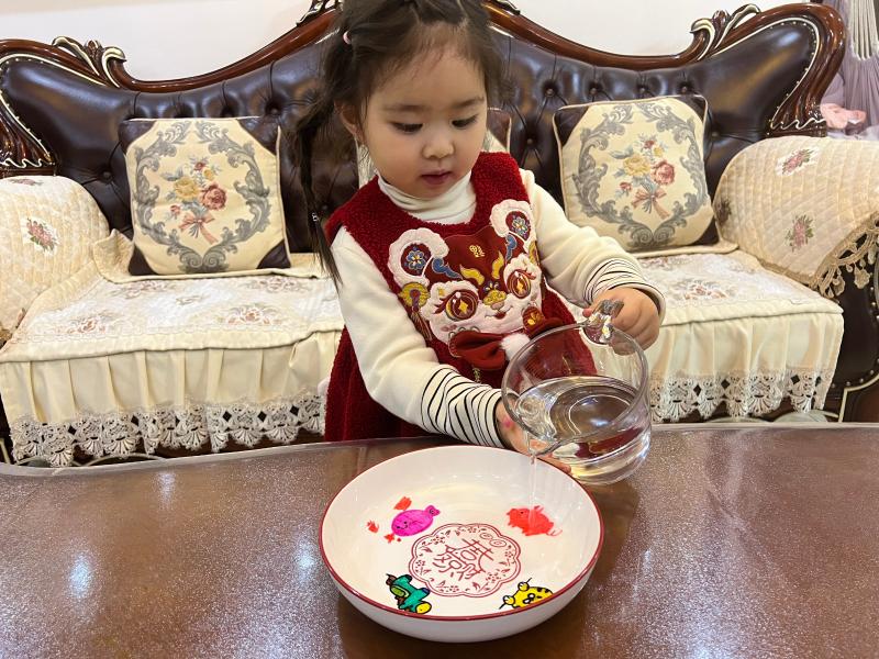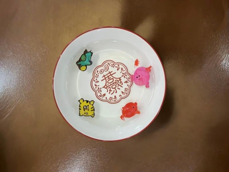 5.待图案完全脱离容器底部后,便会飘到水面上,我们可以轻轻吹气,让它们在水面上飘动起来。