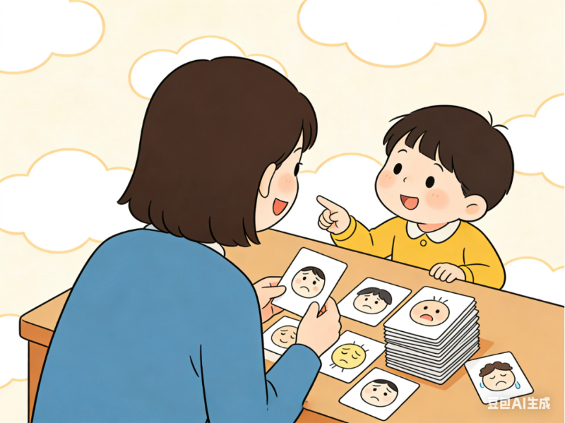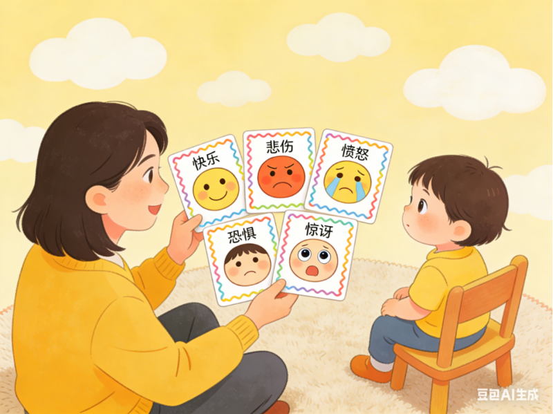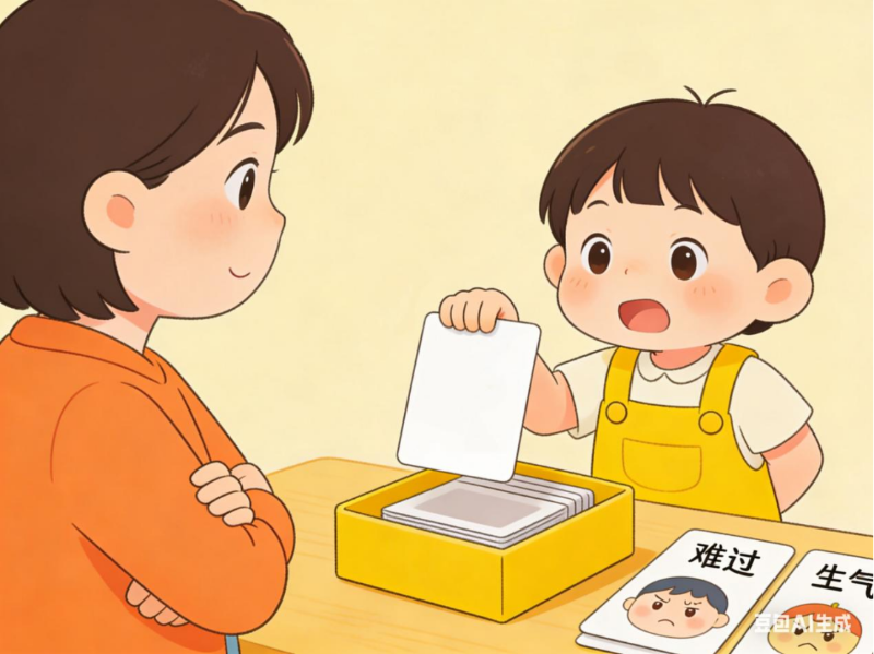 家长和孩子面对面站立,家长先抽取一张情绪卡片,不说话,只用表情+动作表演出卡片上的情绪,让孩子观察并大声说出情绪名称,猜对后立刻拥抱表扬。依次示范5种情绪,让孩子先看懂、看会。