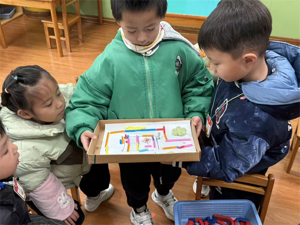 掌握磁铁特性后,幼儿化身“小小工程师”制作磁力迷宫。他们分组测试底板材料,选定薄纸板、塑料膜为最优方案,结合废旧材料自主设计路线,并用吸管、木棍制作围栏,解决棋子滑落问题,合作完成迷宫制作。