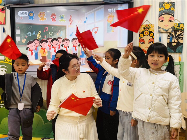 以歌声为纽带,让红色润童心。京福党员教师刘茜走进大一班,开展“红色启蒙教育进班级”活动。活动现场,教师端坐琴前,奏响《歌唱祖国》激昂悠扬的旋律,带领孩子们齐声歌唱。孩子们手持鲜艳的五星红旗,用清脆纯真的童声歌颂祖国,小小红旗在手中挥舞,成为教室里最亮丽的风景。学唱结束后,幼儿还自主进行动作创编与分组展演,在欢快的旋律中感受红色音乐的魅力,在潜移默化中厚植爱国情感,让红色基因在心中生根发芽。