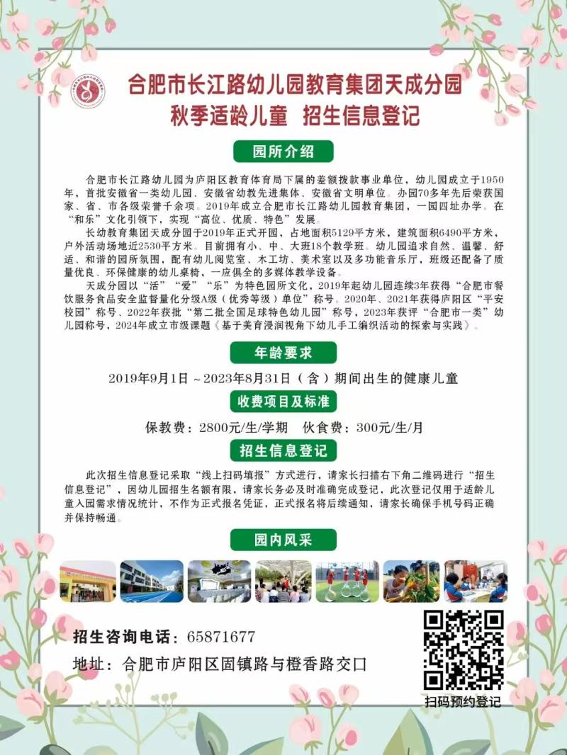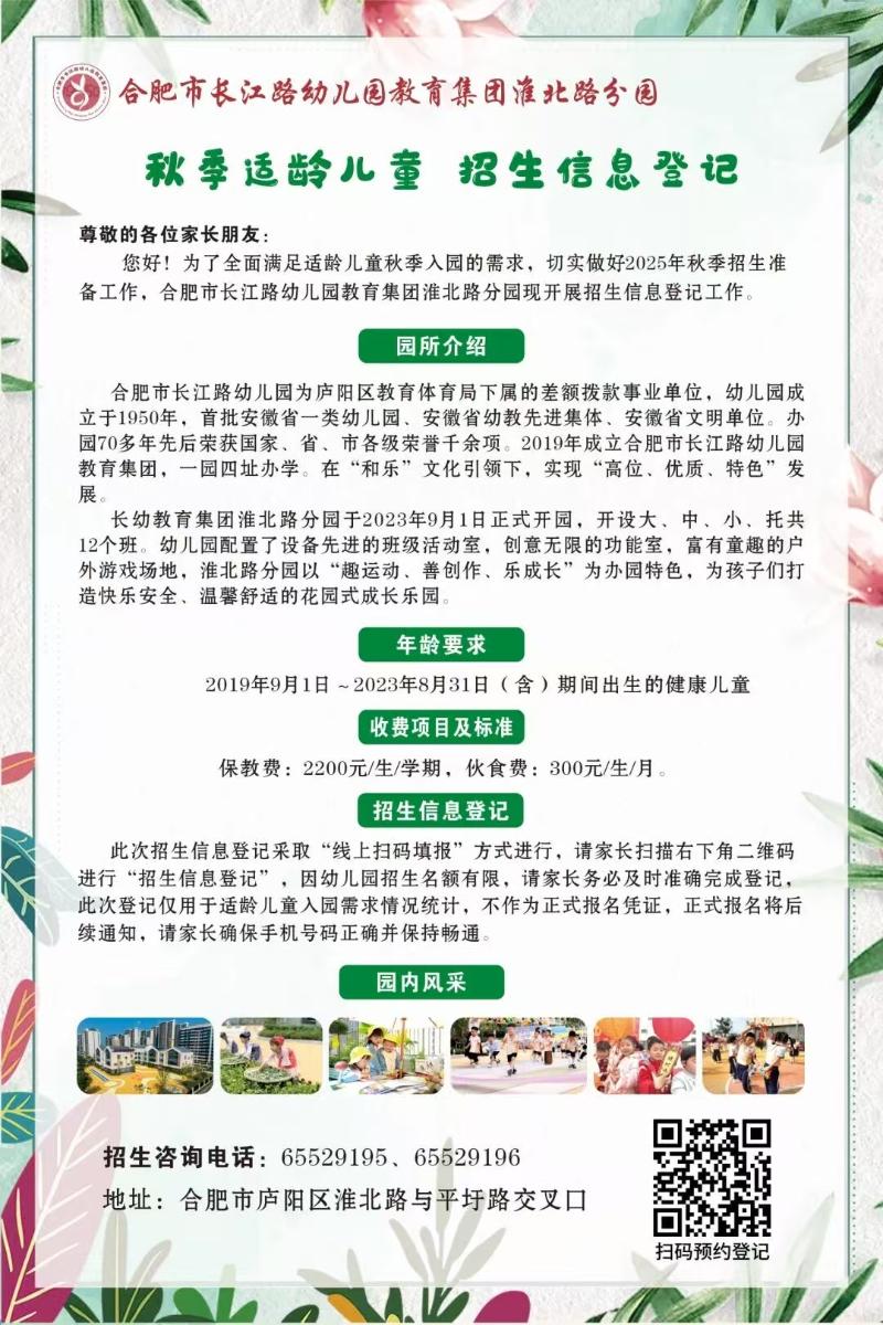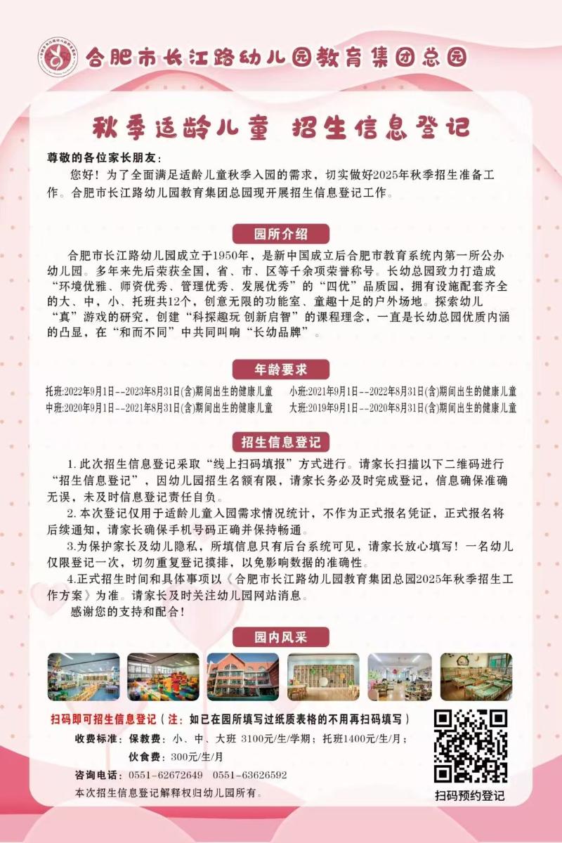 您好!为了全面满足适龄儿童秋季入园的需求,切实做好2025年秋季招生准备工作。合肥市长江路幼儿园教育集团四园开展招生信息登记工作。本次招生登记涉及四所园区,各园地理位置不同,请各位家长朋友们填报时请留意各园招生细则,选择对应园区填写入园调查表。欢迎宝贝们的到来!